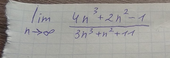 Разделим числитель и знаменатель на n³, получим 4+2/n-1/n³ в числителе и 3+1/n+11/n³ в знаменателе. Т.к. n→∞, остается 4+0-0 в числителе и 3+0+0 в заменателе, или просто 4/3.