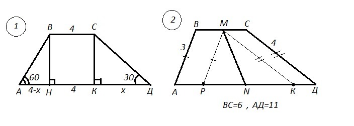 1) АВСД - трапеция , АД=8 см , ВС=4 см , ∠АДС=30° , ∠ВАД=60° .