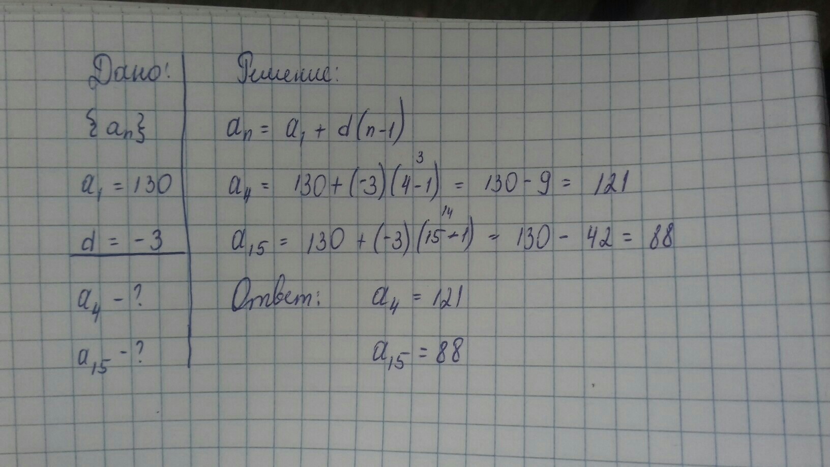 найдите:а)четвертый:б) пятнадцатый член арифметической прогрессии, у которой первый член равен 130,а разность -(-3).