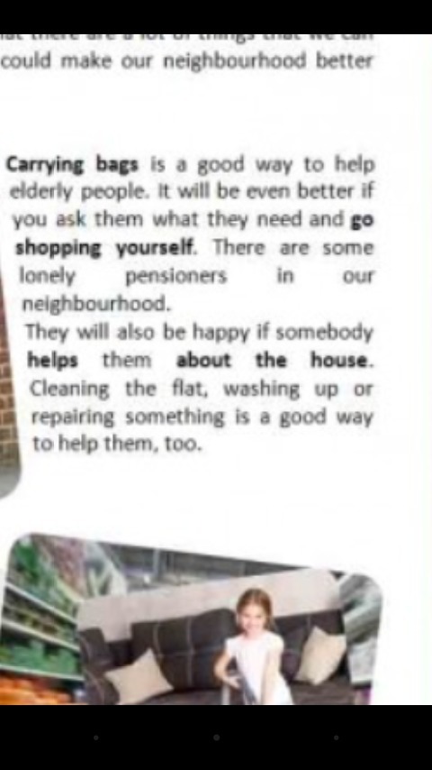 Перенос сумок хороший способ помочь пожилым людям. Будет еще лучше, если вы спросите их, что им нужно, и пойдите по магазинам самостоятельно. В нашем районе есть одинокие пенсионеры. Они также будут рады, если кто-нибудь поможет им в доме. Уборка квартиры, стирка или ремонт чего-то тоже хороший способ помочь им. Зимой бывает много снега. Так, молодые люди могут помочь очистить снег во дворе. Все будут за это благодарны, особенно владельцы автомобилей