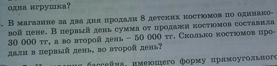 30000+50000=80000 . 80000/8=10000(цена одного костюма ) => 30000/10000 =3 (костюма продано в первый день)