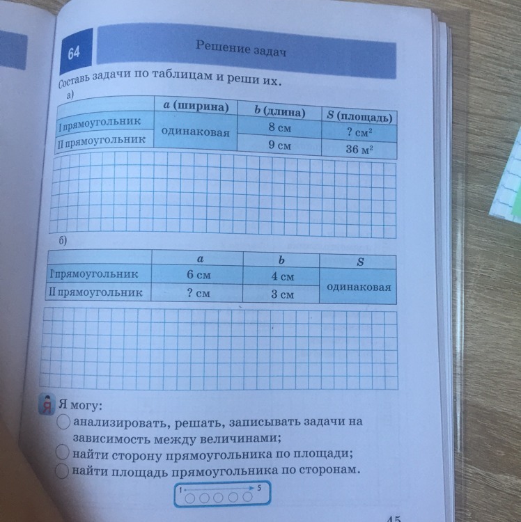 Решение: Площадь второго прямоугольника делим на известную сторону и находим неизвестную сторону, а с помощью неизвестной стороны мы найдём площадь первого прямоугольника.