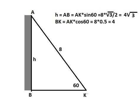 Вертикальная башня видна из точки К на поверхности земли под углом 60 градусов. Найдите высоту башни и расстояние от точки К до основания башни если расстояние от точки К до самой высокой точки башни равно 8 м. Срочно срочно срочно!!!!!!!