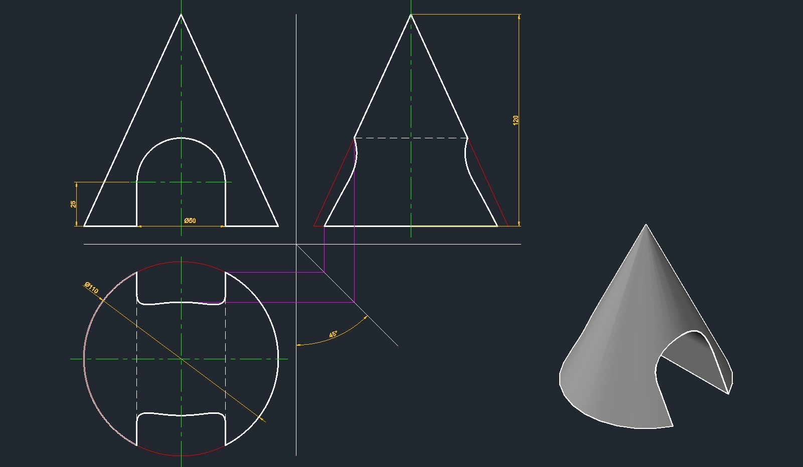 Тогда вид с боку у вас будет: одна из сторон этого "треугольника" и круг в разрезе.