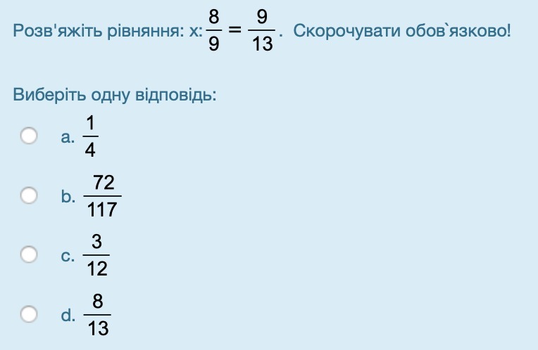 ответ будет d. 8/13 ,если мы 9/13 * 8/9 мы узнаем,что за х скрывается дробь 8/13