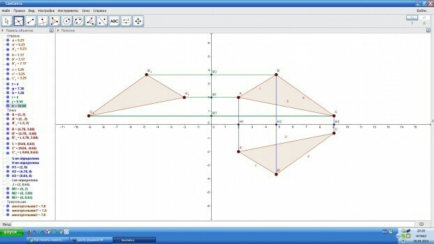 Чтобы построить фигуру симметрично оси Ох нужно симметрично отобразить все точки этой фигуры. Например, треугольник однозначно определяется тремя вершинами, поэтому чтобы построить треугольник симметричный данному относительно оси Ох, мы строим точки симметричные вершинам (на рис. это точки А', B', C') Треугольник A'B'C' симметричен треугольнику АВС относительно Ох