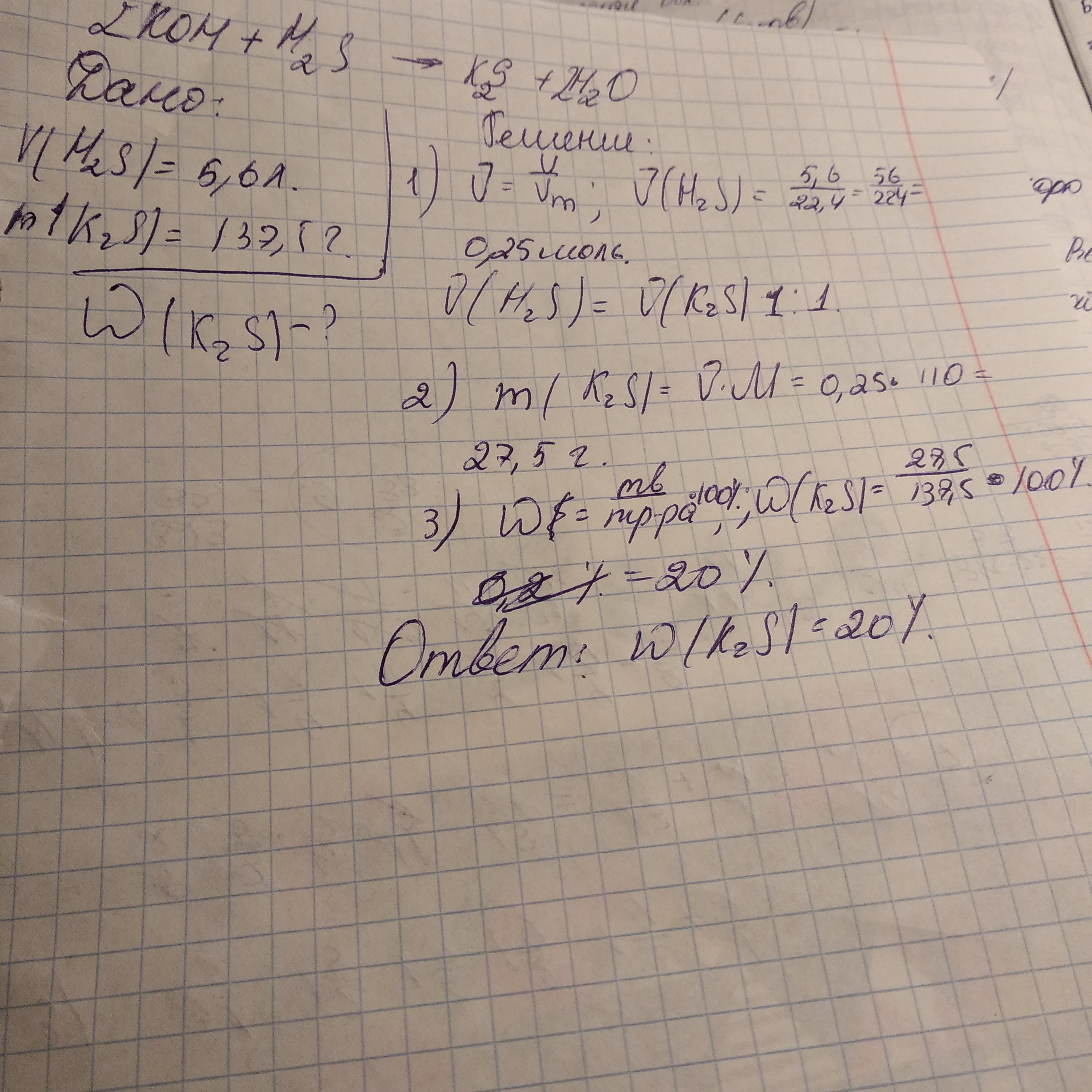 Помогите пожалуйста умоляю срочно надо После пропускания через раствор гидроксида калия 5,6 л сероводорода (н.у.) получили 137,5 г раствора сульфида калия. Вычислите массовую долю соли в полученном растворе. 3. К раствору фосфата натрия с массовой долей 2% добавили избыток раствора хлорида кальция. При этом выпал осадок массой 31 г. Определите массу исходного раствора фосфата натрия. 4.К 42,5 г раствора с массовой долей нитрата серебра 2% добавили избыток раствора йодида натрия. Определите массу выпавшего осадка.