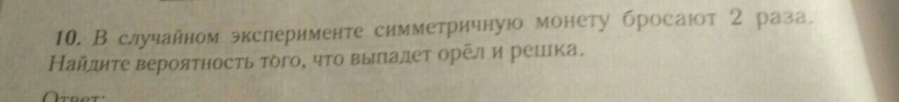 Возьмём это событие и разобьем на два броска монеты шанс выпадения орла 0,5, и шанс выпадения решки при втором броске тоже 0,5. Умножаем вероятности и получаем 0,25. В условии задачи не указан порядок орла и решки, поэтому шанс, что сначала будет решка, а потом орёл тоже 0,25. Складываем 0,25 + 0,25 = 0,5.