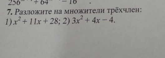 1) {x}^{2}  + 11x + 28 =  {x}^{2}  + 7x + 4x + 28 = x(x + 7) + 4(x + 7) = (x + 4)(x + 7) \ 2)3 {x}^{2}  + 4x - 4 = 3{x}^{2}  - 2x + 6x - 4 = x(3x - 2)  + 2(3x - 2) = (x + 2)(3x - 2)