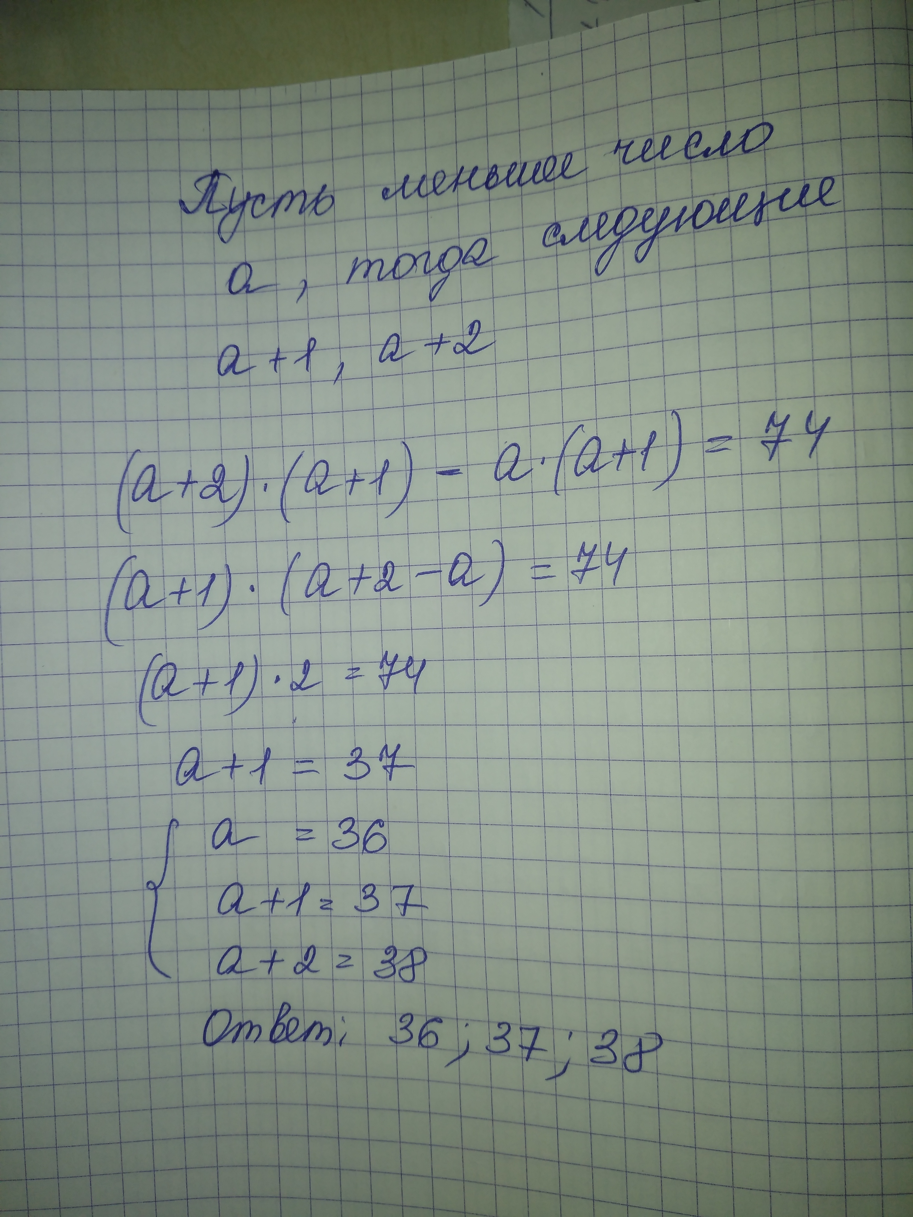 Найдите три последовательных числа если известно что разность произведения двух больших и произведения двух меньших из этих чисел равна 74