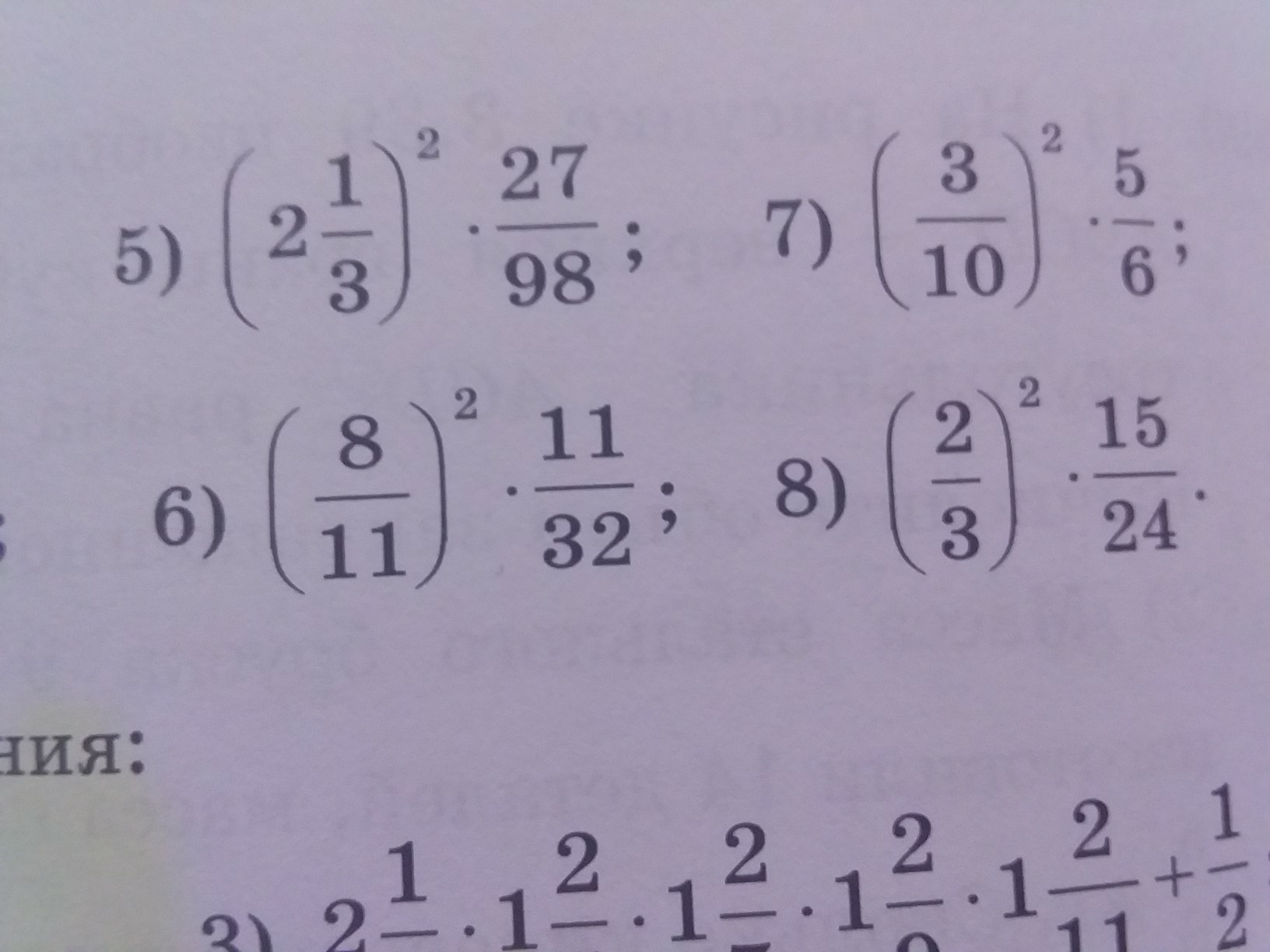 (2 1/3)^2 * 27/98 (Переводим в обык дробь) = (7/3)^2 * 27/98 = 49/9 * 27/98 (Сокращаем) = 3/2 = 1 1/2
