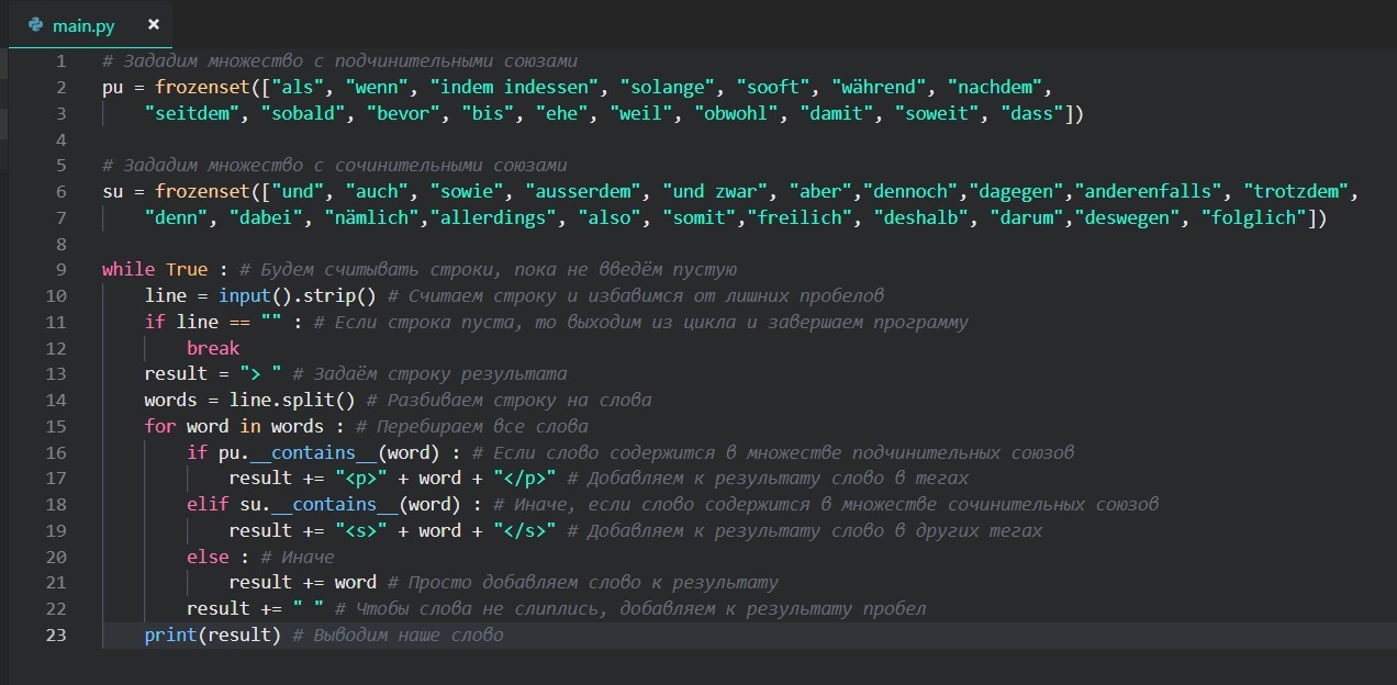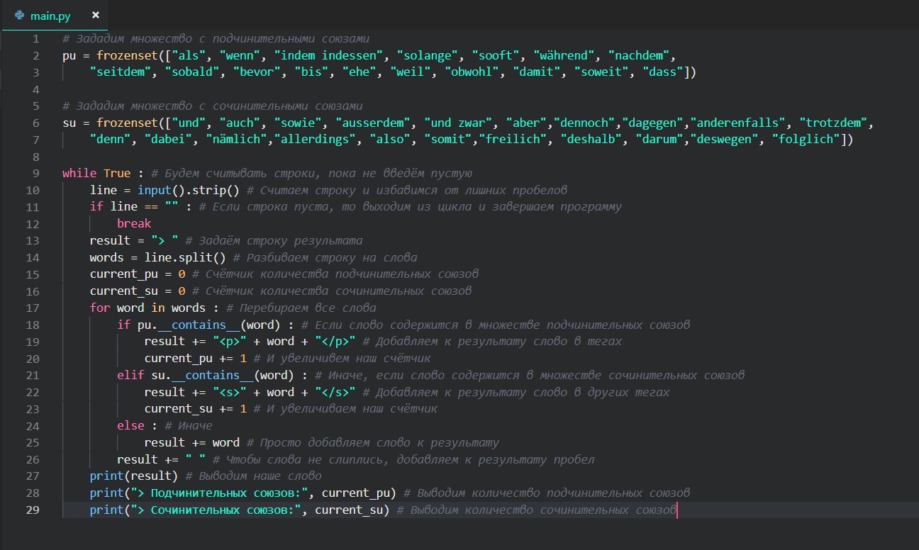 Надо, чтобы в предложениях на немецком языке программа видела подчинительные союзы и ставила на них тег, то же - с сочинительными союзами.