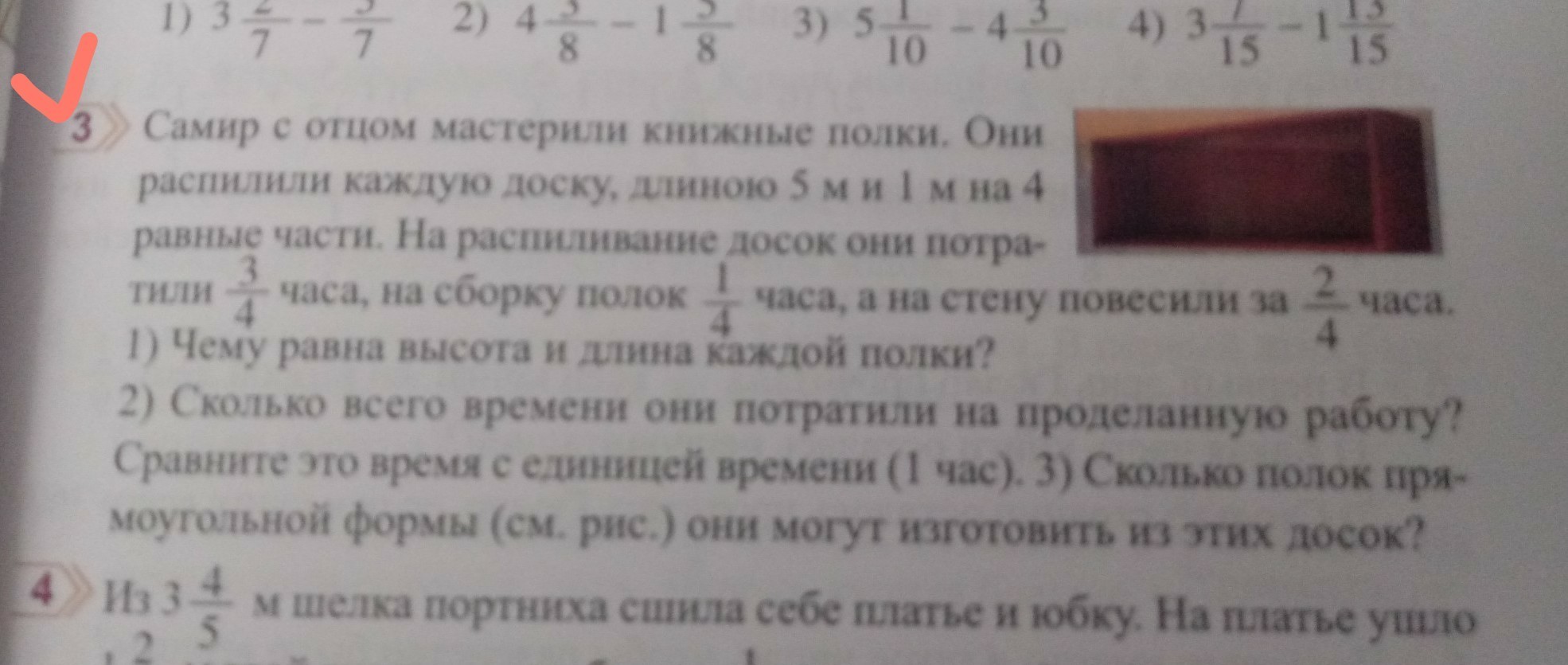 а = 5 м : 4 = 5/4 = 1 1/4 = 1 м 25 см - длина полок - ОТВЕТ