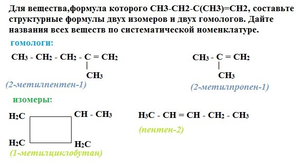 Для вещества,формула которого CH3-CH2-C(CH3)=CH2, составьте структурные формулы двух изомеров и двух гомологов. Дайте названия всех веществ по систематической номенклатуре.
