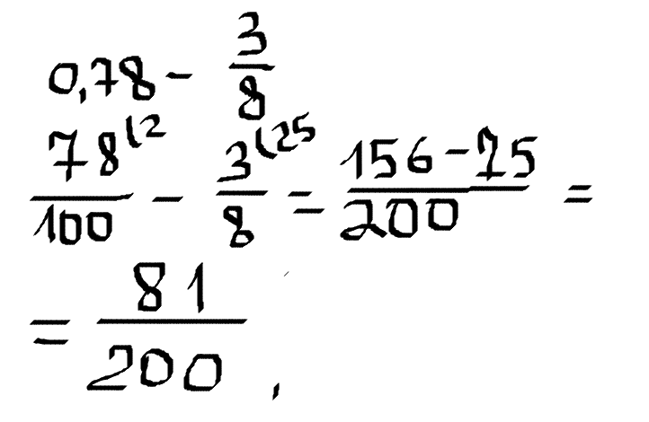 Во-первых тебе что бы посчитать нужно число 0.78 представить в виде дроби, как и 3/8. Ты смотришь сколько у тебя чисел после запятой, у тебя 2 числа это 7 и 8.Значит это разряд сотен. И записываешь дробь в таком виде 78/100, И считаешь.
