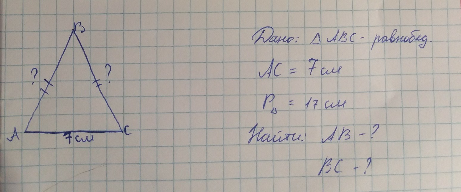 В равнобедренном треугольнике основание равно 7 см, а периметр равен 17см. Вычислите боковую сторону треугольника.