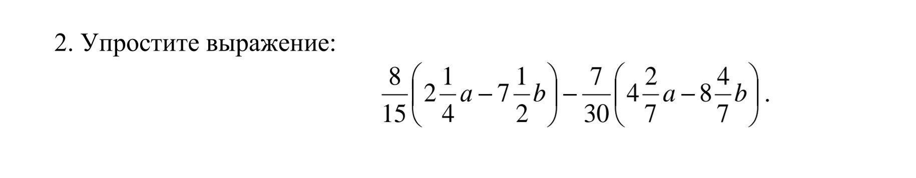 8/15(9/4а-15/2б)-7/30(30/7а-60/7б) = 8/15*9/4а-8/15*15/2б-7/30*30/7а+7/30*60/7б=3/5а-4б-а+2б =-2б-2/5а