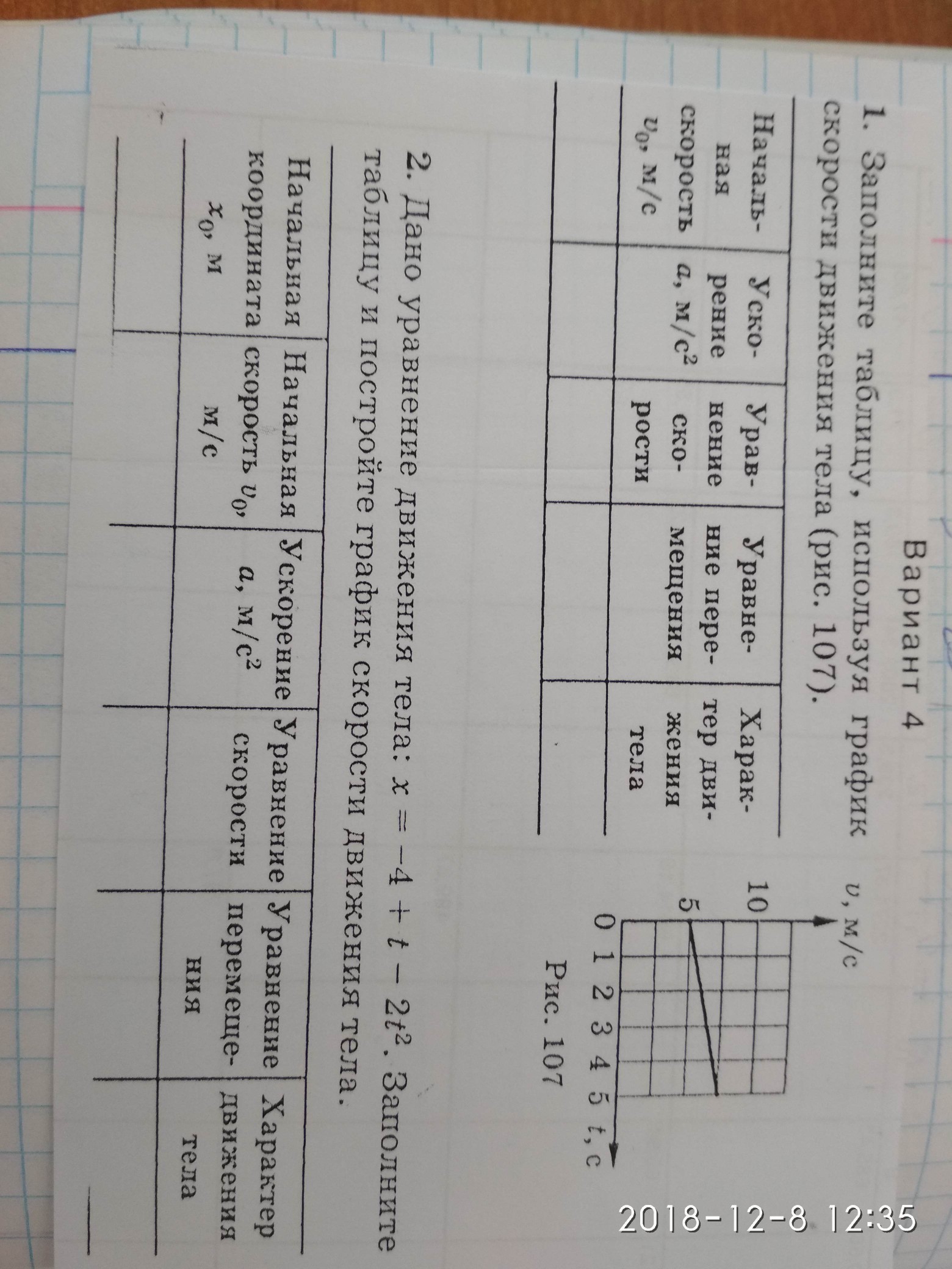 2. Используя все то же уравнение x=x0+υ0*t+(at^2)/2 сравниваем его с тем, которое дано (x=-4+t-2t^2). Отсюда можно выяснить, что x0=-4м, υ0=1м/с, а=-4м/с^2 (если -4 поделить на 2, как раз получится -2), движение равноускоренное, значит формула скорости: υ=υ0+at=1+at, а уравнение перемещения - S=t-2t^2.