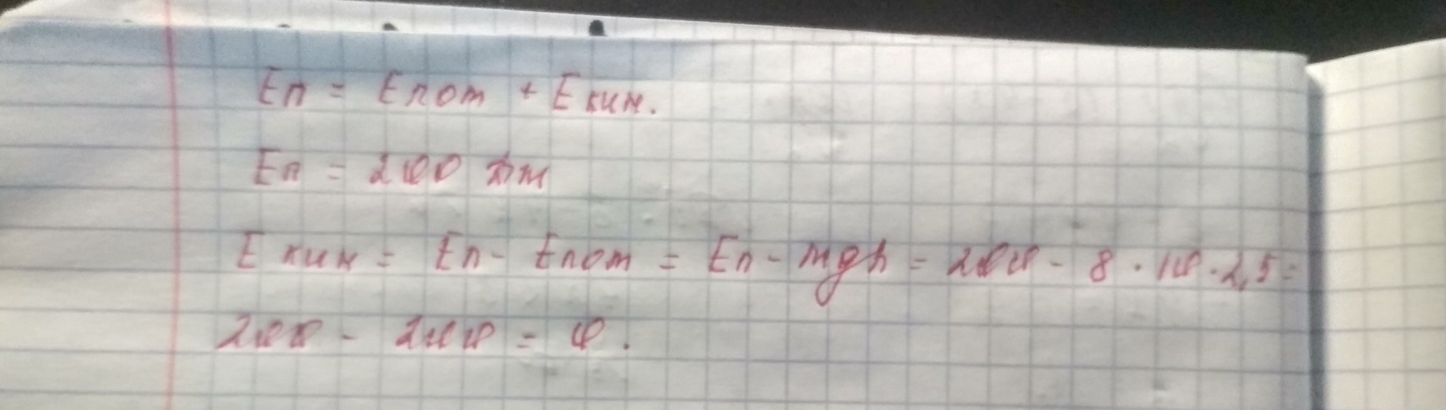 Ек = Е - Еп = 200 - 200 = 0 Дж