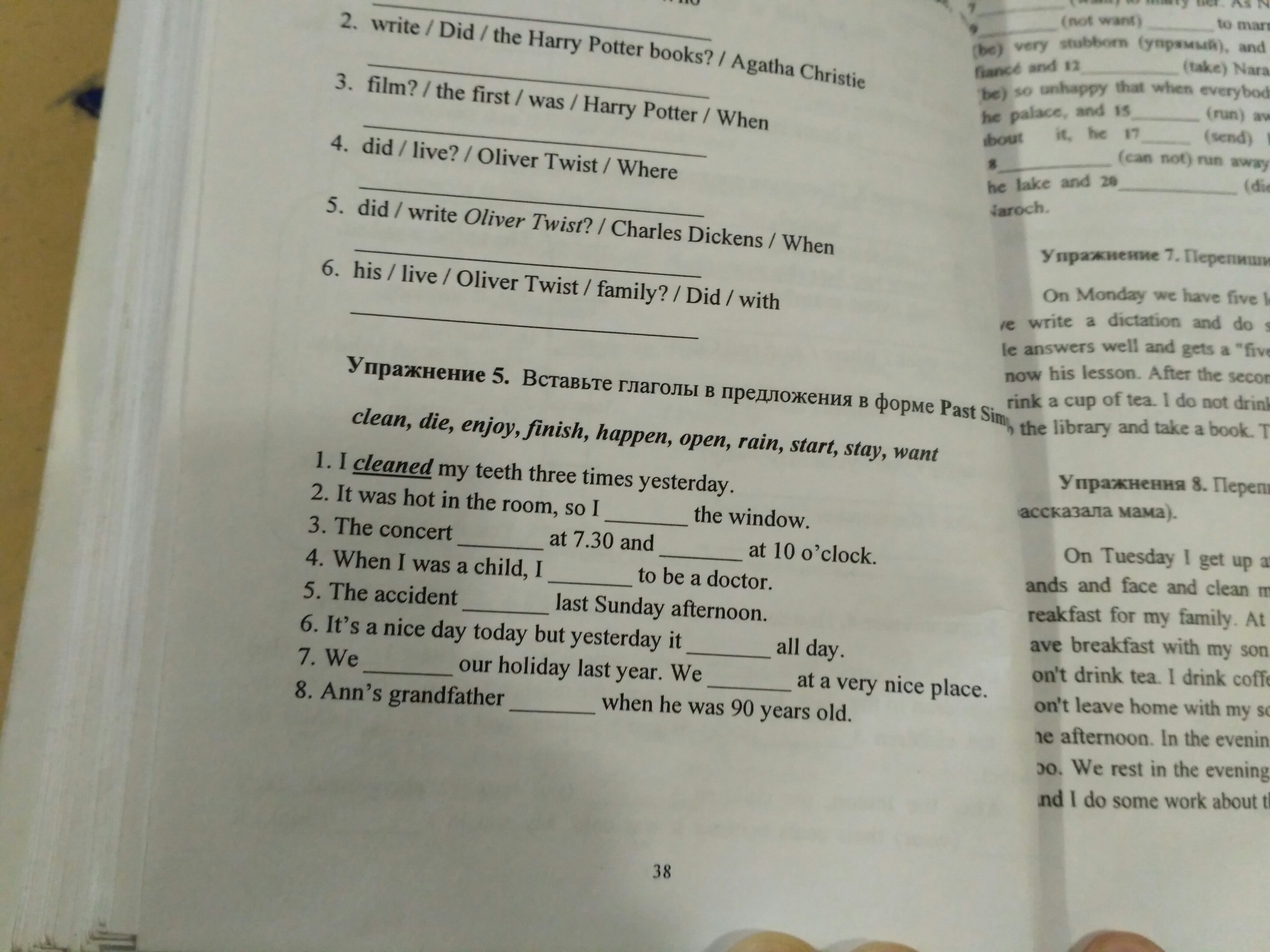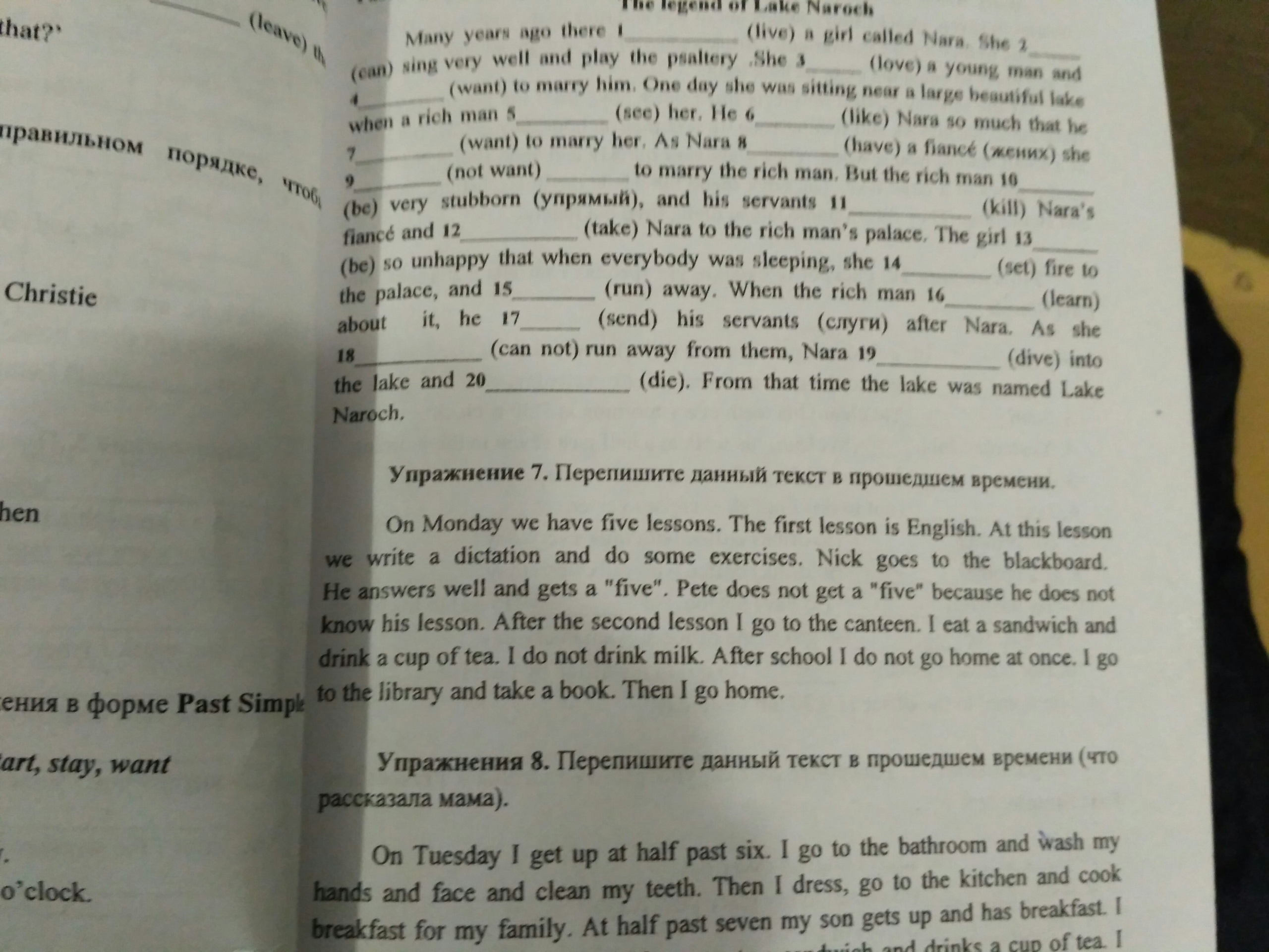 On Monday we had five lessons. The first lesson was English. at this lesson we wrote a dictation and did some exercises. Nick went to the blackboard. He answered well and got a “five”. Peter didn’t get a “five” because he didn’t know his lesson. After the second lesson I went to the canteen. I ate a sandwich and drank a cup of tea. I didn’t drink milk. After school I didn’t go home at once. I went to the library and took a book. Then I went home.