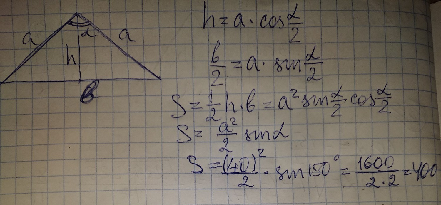 Угол при вершине, противолежащей основанию равнобедренного треугольника, равен 150°. Боковая сторона треугольника равна 40. Найдите площадь этого треугольника.