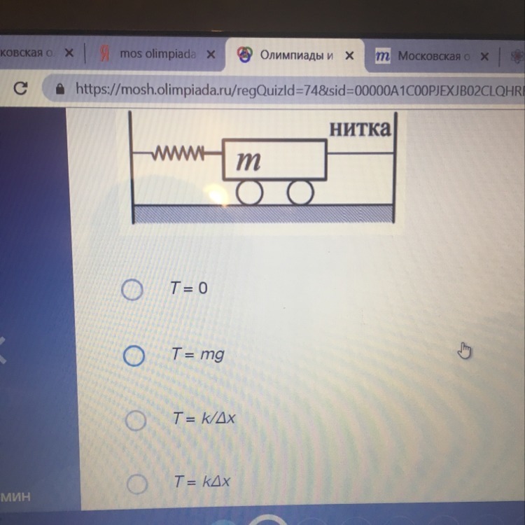 Тележка массой m с одной стороны среднемесячную со стенкой пружиной жёсткостью k, деформация которой равна дельта x, а с другой — невесомой нитью.