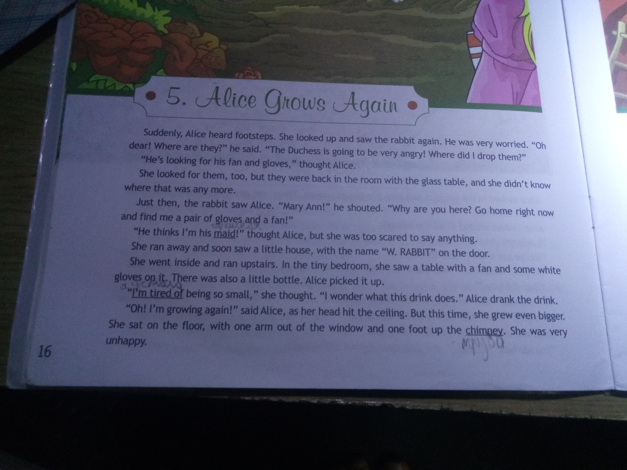 Внезапно Алиса услышала шаги. Она подняла голову и снова увидела кролика. Он был очень осторожен. «О, дорогой, где они», - сказал он. «Герцогиня очень рассердится! Куда я их бросила?» Он ищет свой веер и перчатки », - подумала Алиса. Она тоже их искала, но они вернулись в комнату со стеклянным столом, и она не знала, что именно тогда кролик увидел Алису. "Мэри Энн!" он крикнул. «Почему ты здесь? Иди домой прямо сейчас.« Он думает, что я его служанка! »- подумала Алиса, но она была слишком напугана, чтобы сказать что-нибудь еще, и найти мне пару перчаток и веер! Вскоре она увидела красивый дом с именем «W.RABBIT» на двери. Она вошла и побежала наверх. В крошечной спальне она увидела стол с веером и какой-то белой любовью на нем. Также была маленькая бутылочка. Алиса подняла его, будучи такой маленькой, - подумала она. «Интересно, что делает этот напиток». Алиса выпила напиток. "О! Я снова расту!" сказала Алиса, когда ее голова ударилась в камеру. Но на этот раз она выросла еще больше. Она была очень. Она сидела на полу, одна рука высовывалась из окна, а другая - несчастной.
