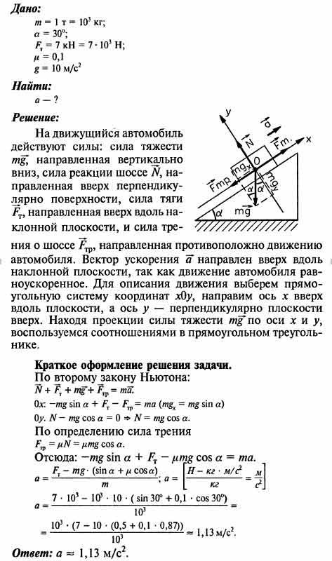Автомобиль массой 1 т понимается по шоссе с уклоном 30° под действием силы тяги 7 кН. Коэффициент трения между шинами автомобиля и поверхностью шоссе равен 0.1. Найти ускорение автомобиля