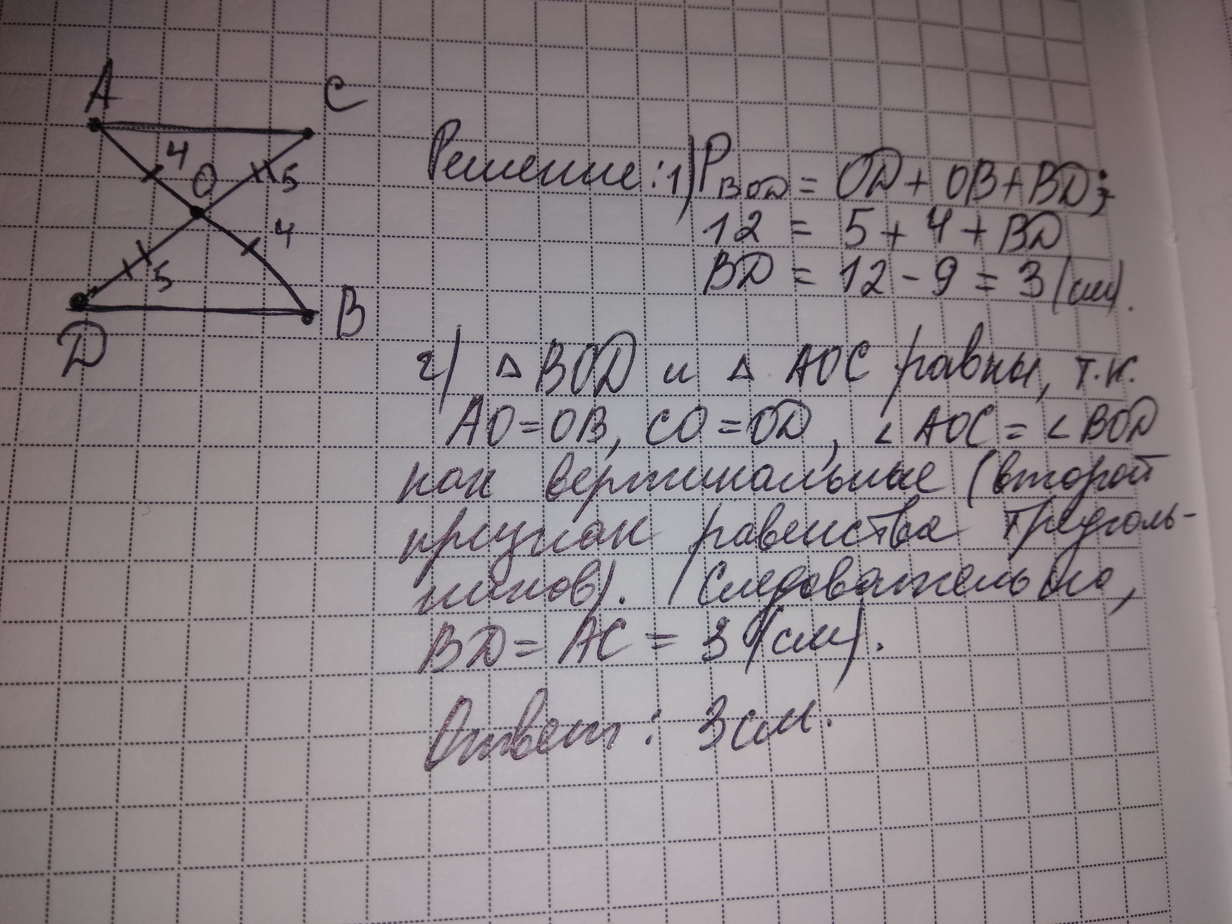 Отрезки AB и CD пересекаются в точке O и точкой пересечения делятся пополам. При этом АО=4см, СD=10см, а периметр треугольника ВОД=12см. Найдите длину стороны АС.