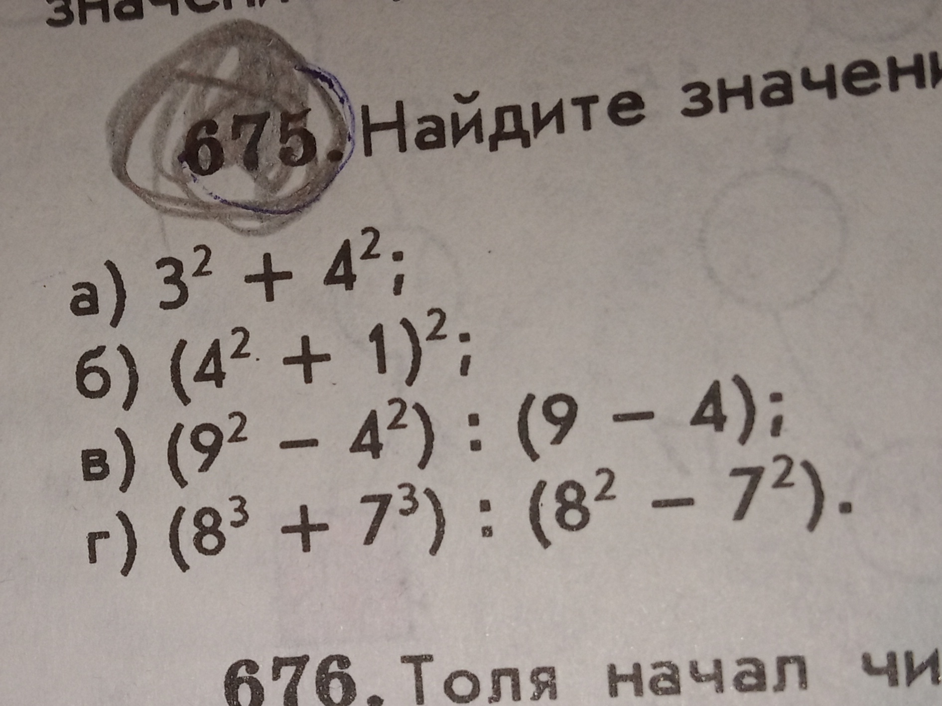 г) (8³+7³):(8²-7²)=(512+343):(64-49)=855:15=57