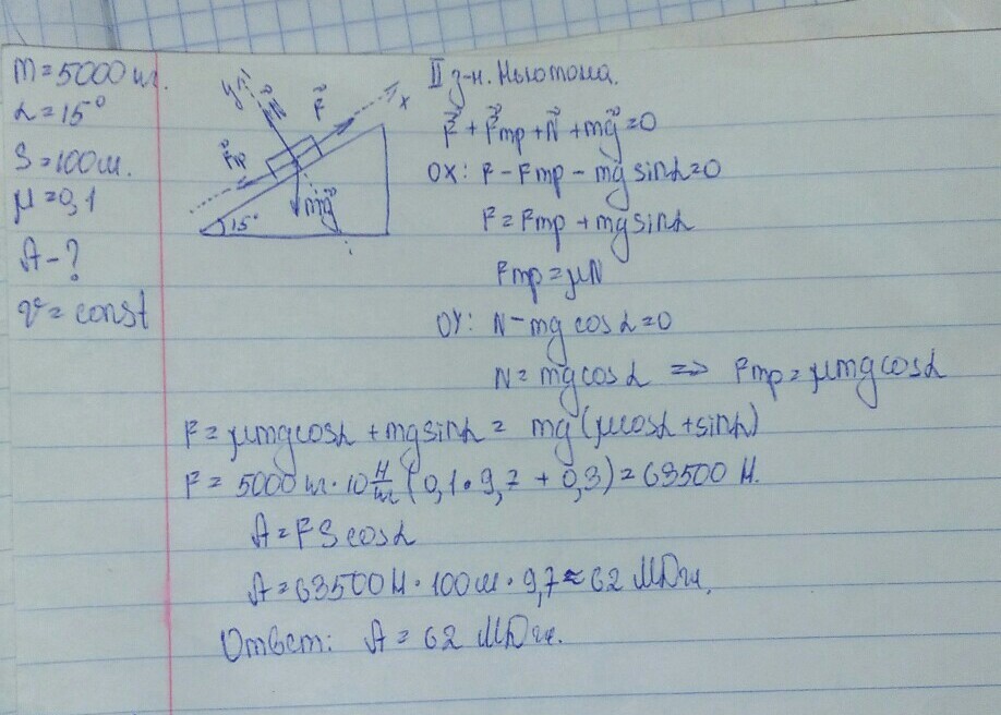 Грузовик массой 5 т движется равномерно в гору, которая образует угол 15 ° с горизонтом. Какую работу совершает двигатель грузовика на пути 100 м? Коэффициент трения равен 0,1