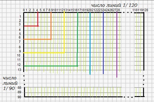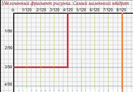 Если добавлять каждый раз с вертикальной стороны по 3 отрезка(3*1/90=3/90), а с горизонтальной стороны по 4 отрезка (4*1/120=4/120), получим последовательность увеличивающихся в размере квадратов, самый большой из которых - исходный, со стороной 90/90 (или 120/120)