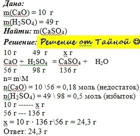 10г оксида кальция прореагировали с роствором, в котором 49г сульфатной кислоты. Рощитайте якакая масса соли создалась при этом.