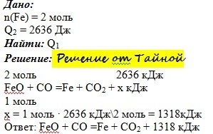 Ферум(ІІ) оксид відновлюється Карбон(IV) оксидом до заліза. Ця реакція супроводжується виділенням 2636 кДж теплоти під час добування 2 моль заліза. Складіть термохімічне рівняння цієї реакції