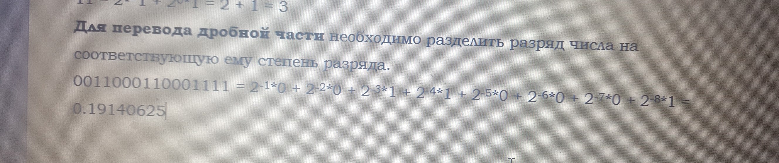 Например 0011000110001111 = 2^15 * 0 + 2^14 * 0 + 2^13 * 1 + 2^12 * 1 + 2^11 * 0 + 2^10 * 0 + 2^9 * 0 + 2^8 * 1 + 2^7 * 1 + 2^6 * 0 + 2^5 * 0 + 2^4 * 0 + 2^3 * 1 + 2^2 * 1 + 2^1 * 1 + 2^0 * 1 = 0 + 0 + 8192 + 4096 + 0 + 0 + 0 + 256 + 128 + 0 + 0 + 0 + 8 + 4 + 2 + 1 = 12687