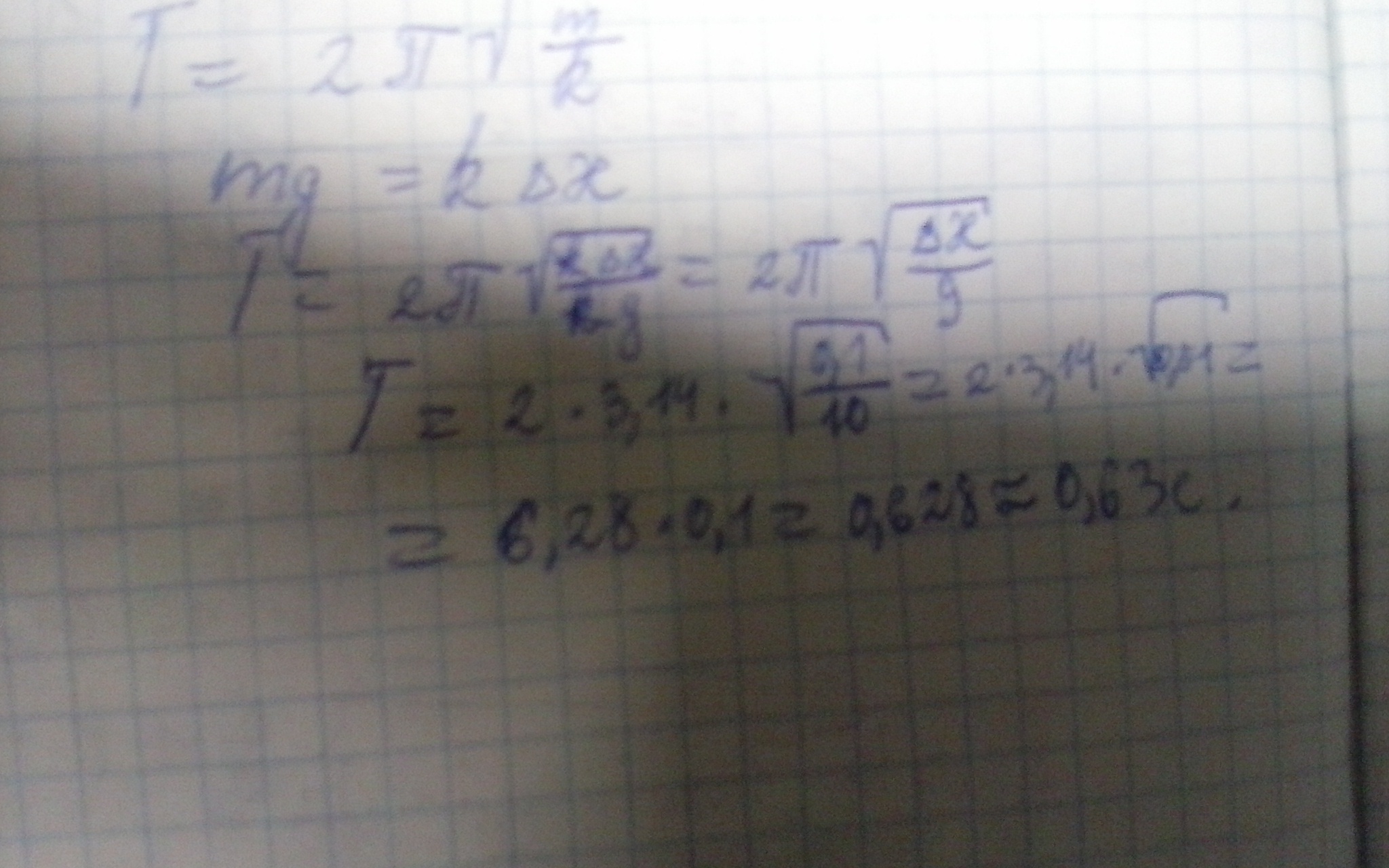 Пружина под действием груза некоторой массы удлинилась на дельта х = 10см. С каким периодом Т будет совершать колебания эта система? Ответ выразить в секундах, округлив до сотых. Ускорение свободного падения считать равным g=10 м/с^2. Число пи = 3,14