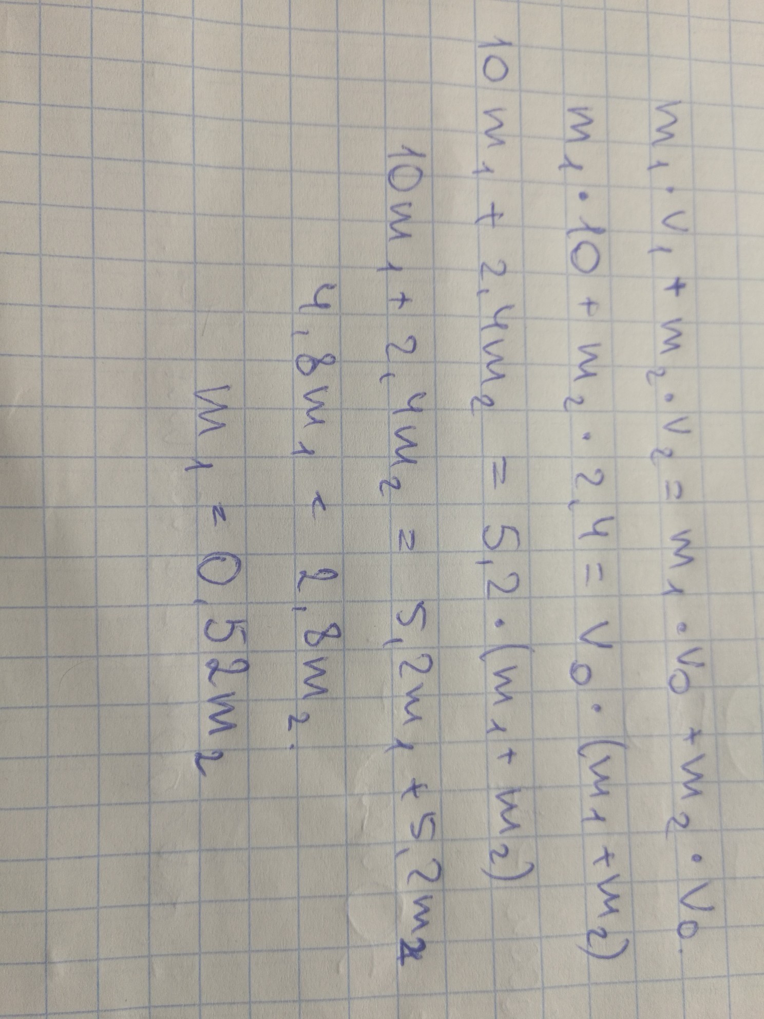 Два объекта массами m1 и m2 движутся друг за другом со скоростями, равными соответственно 10 м/с и 2,4 м/с. После неупругого соударения скорости обоих объектов стали равными 5,2 м/с. Определи отношение масс m1m2 этих объектов.