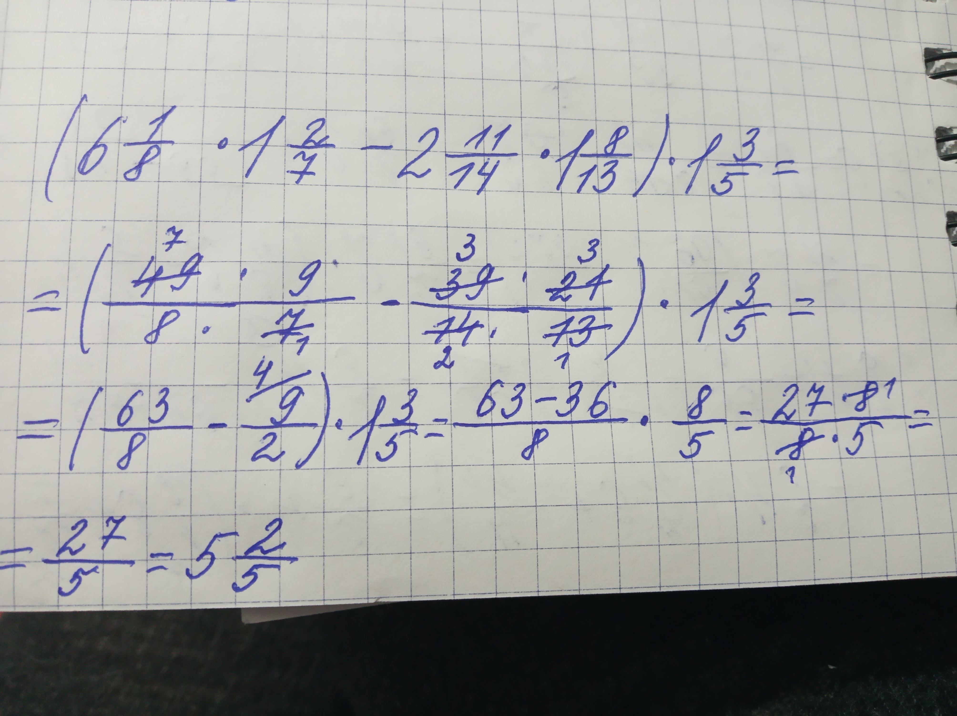 Шесть целых одна восьмая умножить на одну целую две седьмых -2 целых 11 четырнадцатых умножить на одну целую восемь тринадцатых это всё В скобках умножить на одну целых три пятых