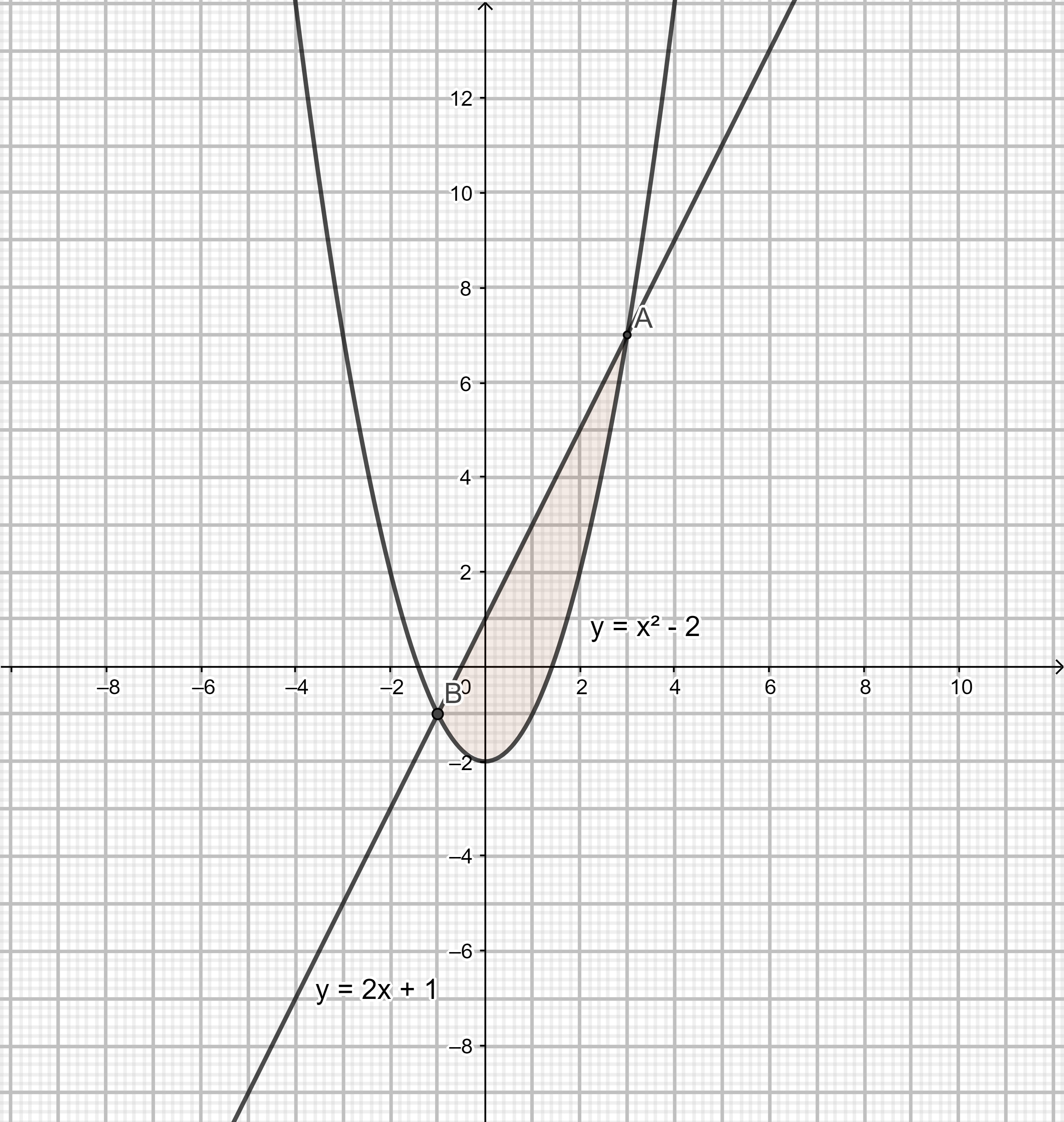 Требуется вычислить площадь, заключенную между параболой y=x^2-2 и прямой y=2x+1.