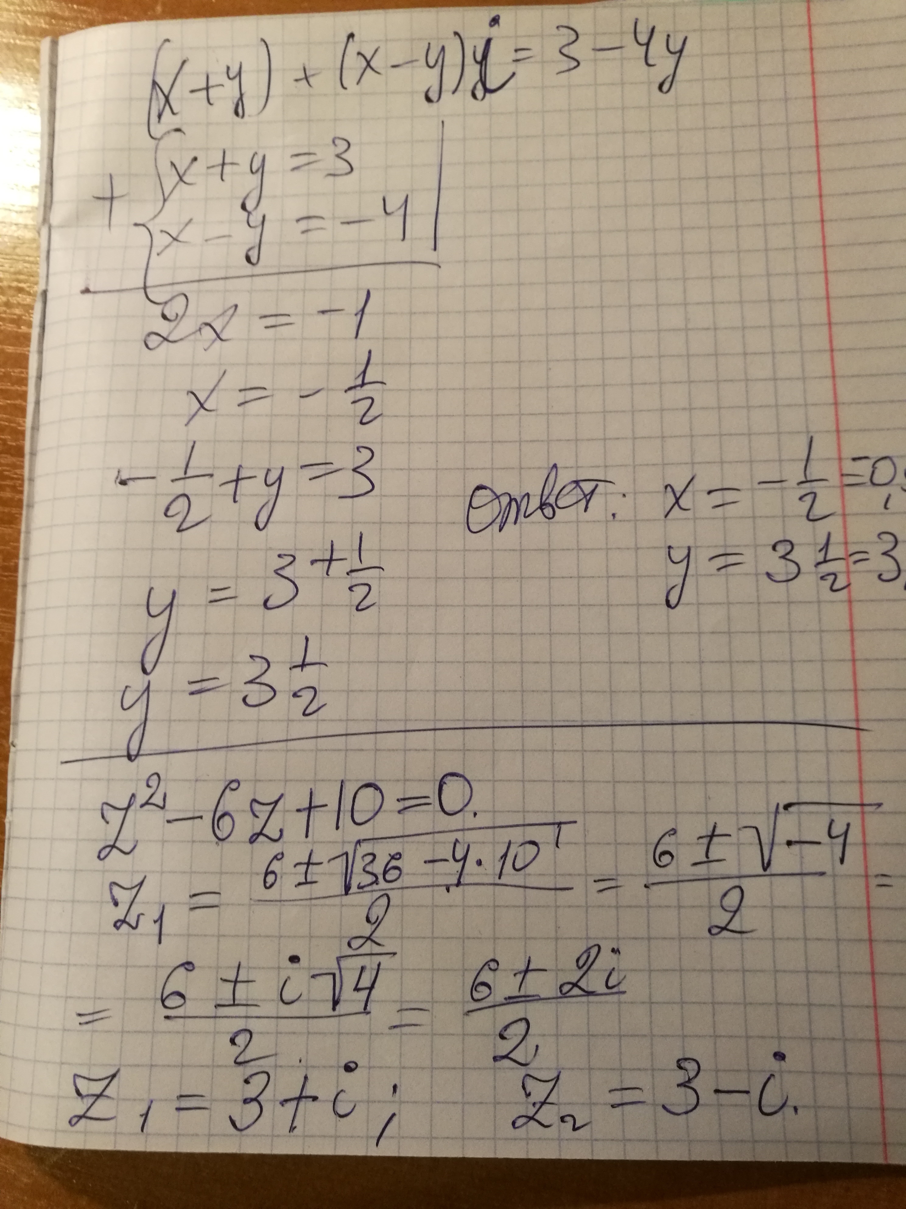 здесь нужно использовать свойство комплексных чисел, что два числа равны тогда и только тогда, когда равны их действительные и мнимые части. приравняем их и получит систему двух уравнений с двумя неизвестными. решение на фото.