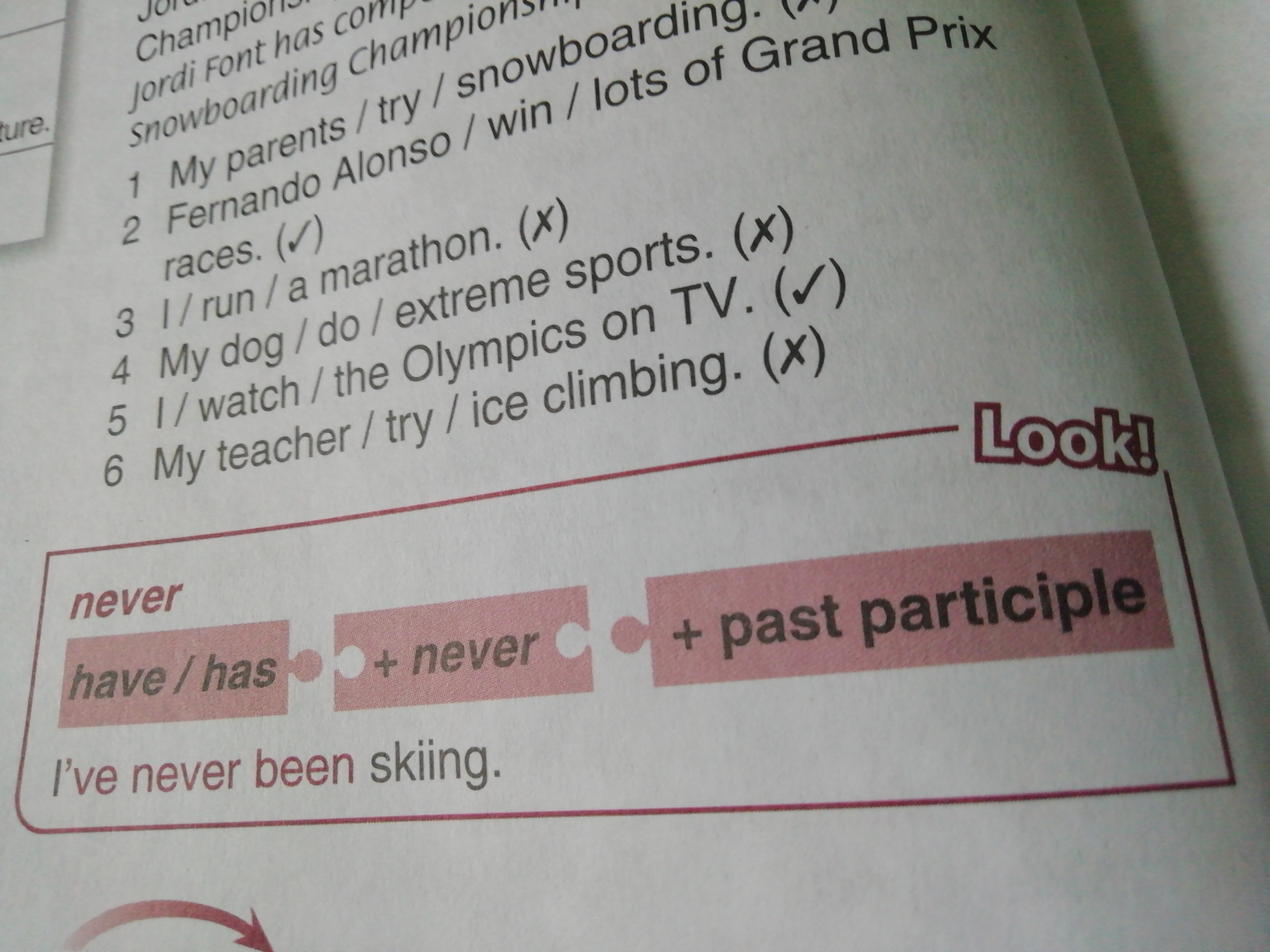 1) I have never climbed a mountain. - Я никогда не взбирался на гору.