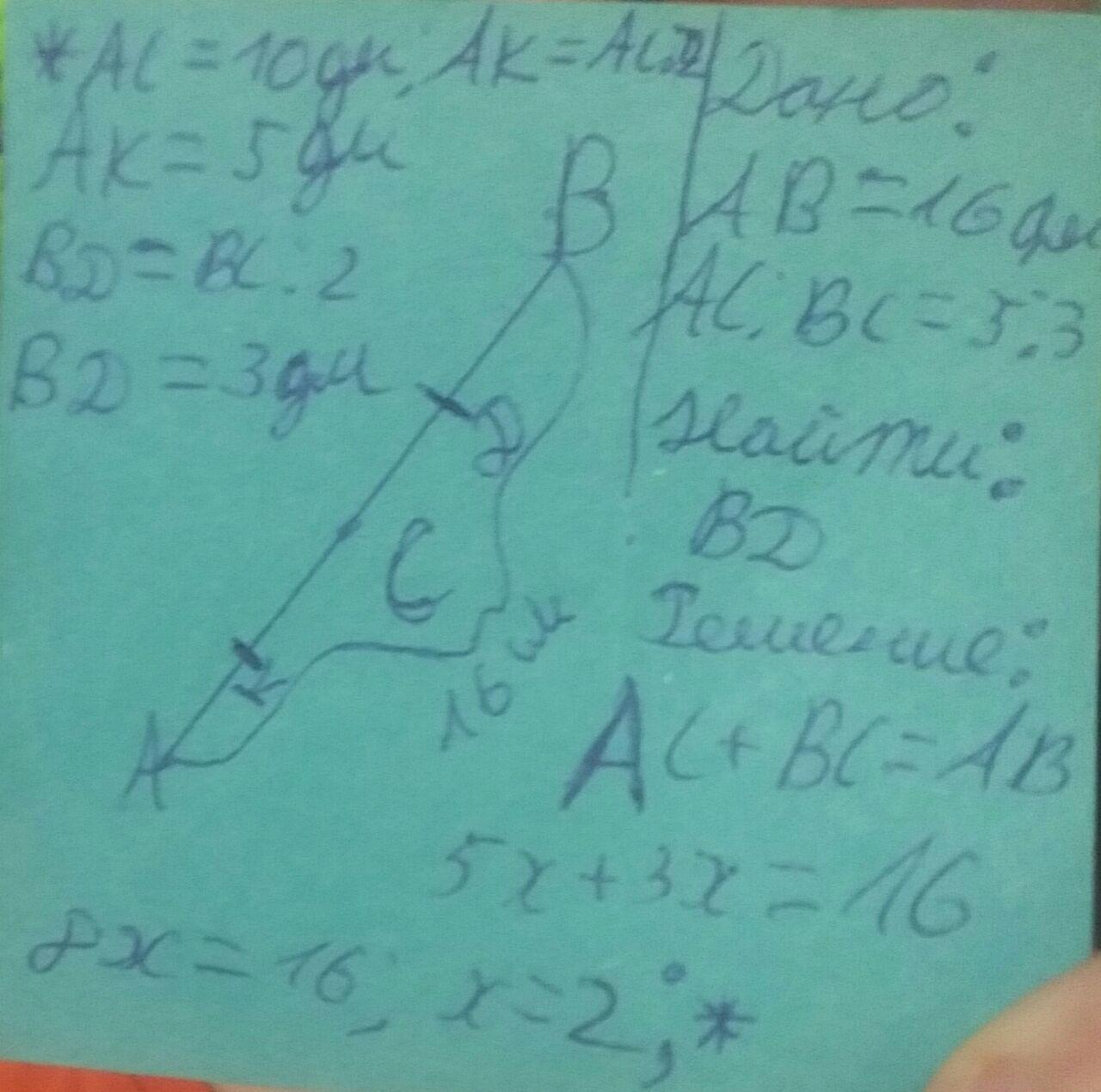 Решение: Найдем для начала длины отрезков AC и BC.На рисунке я их нашел уравнением.Пускай AC будет 5х,а BC 3x.В итоге у нас получится AC=10 дм,а BC=6 дм.Но в условии нас просят найти отрезки меньше длины BC.Поэтому мы делим отрезки AC и BC.В итоге, мы получаем:AK,KC,CD,BD.Чтобы найти AK,я поделил AC на 2,т.к K - средняя линия AC.Тогда KC=AK=5 дм.Такие же действия проделываем и с BC.И мы получим BD=CD=3 дм.
