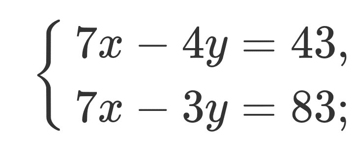 left{ {{7x-4y=43} atop {7x-3y=83}} right. \\left{ {{7x=43+4y} atop {43+4y-3y=83}} right. \\left{ {{7x=43+4y} atop {y=40} right. \\left{ {{7x=43+4*40} atop {y=40} right. \left{ {{7x=203} atop {y=40} right. \left{ {{x=203/7 atop {y=40} right. \\left{ {x=29} atop {y=40} right.