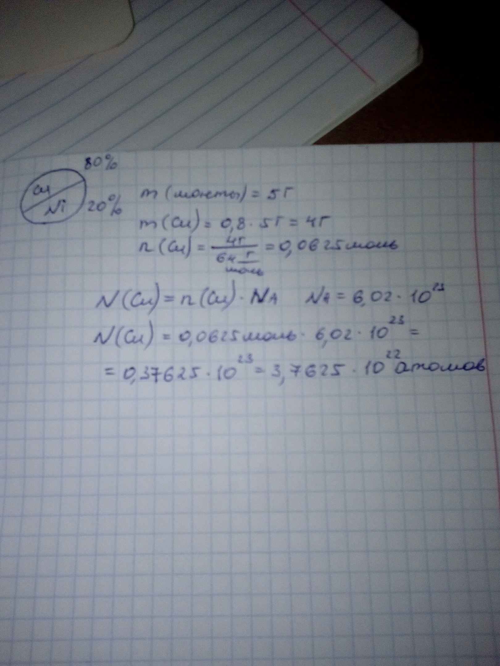 Нам требуется посчитать количество атомов меди. Зная массу монеты и процентное содержание меди, мы можем найти массу самой меди в монете. Затем мы должны посчитать количество вещества меди. Для этого мы массу меди должны разделить на её молярную массу (в табл. Менделеева). Зная количество вещества мы можем найти количество атомов. Для этого количество вещества умножаем на число Авагадро (6,02*10^23)