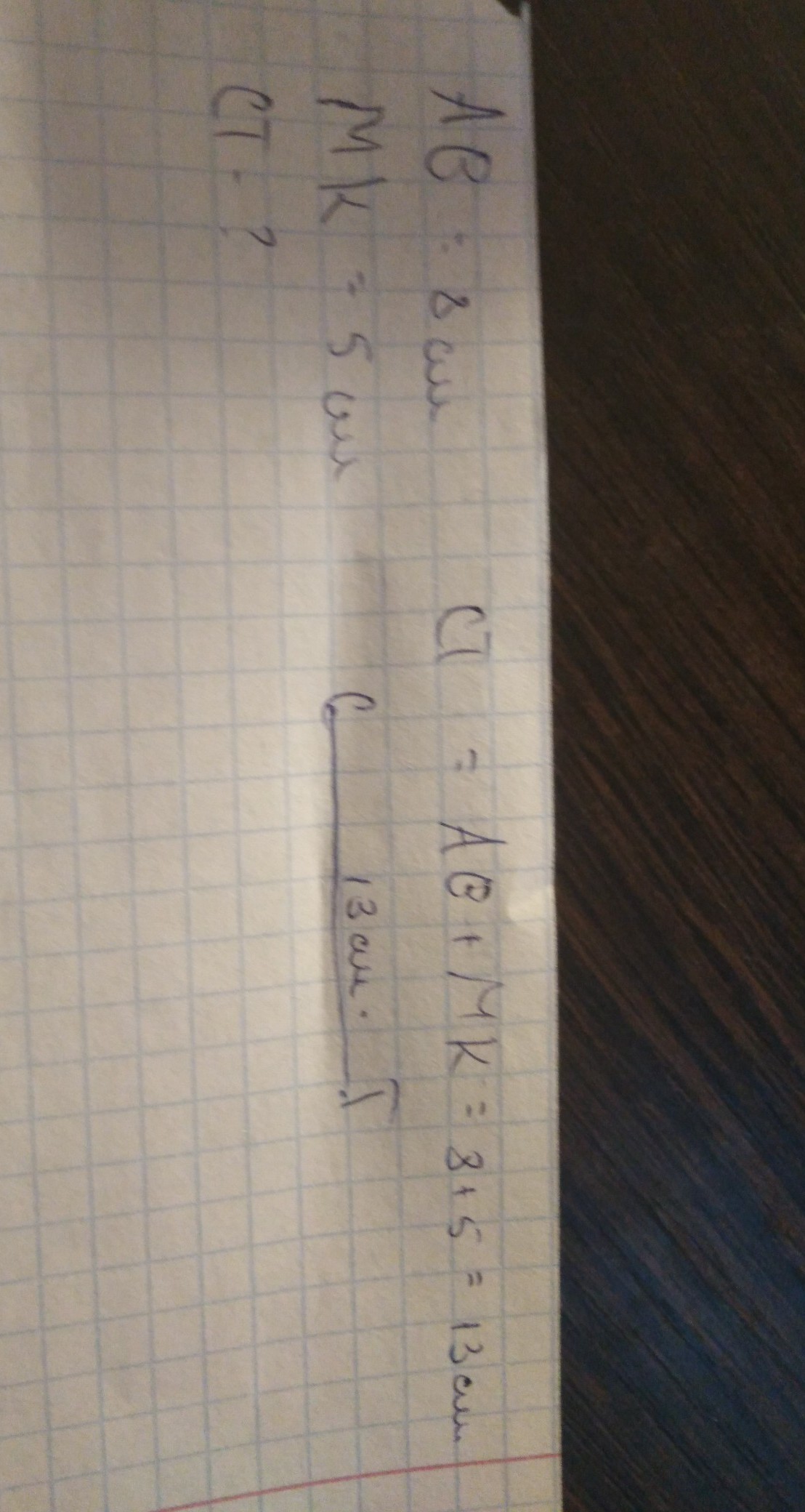 Дано відрізки АВ=8см, МК=5см. Побудуй відрізок СТ, довжина якого дорівнює сумі довжин відрізків АВ і МК.