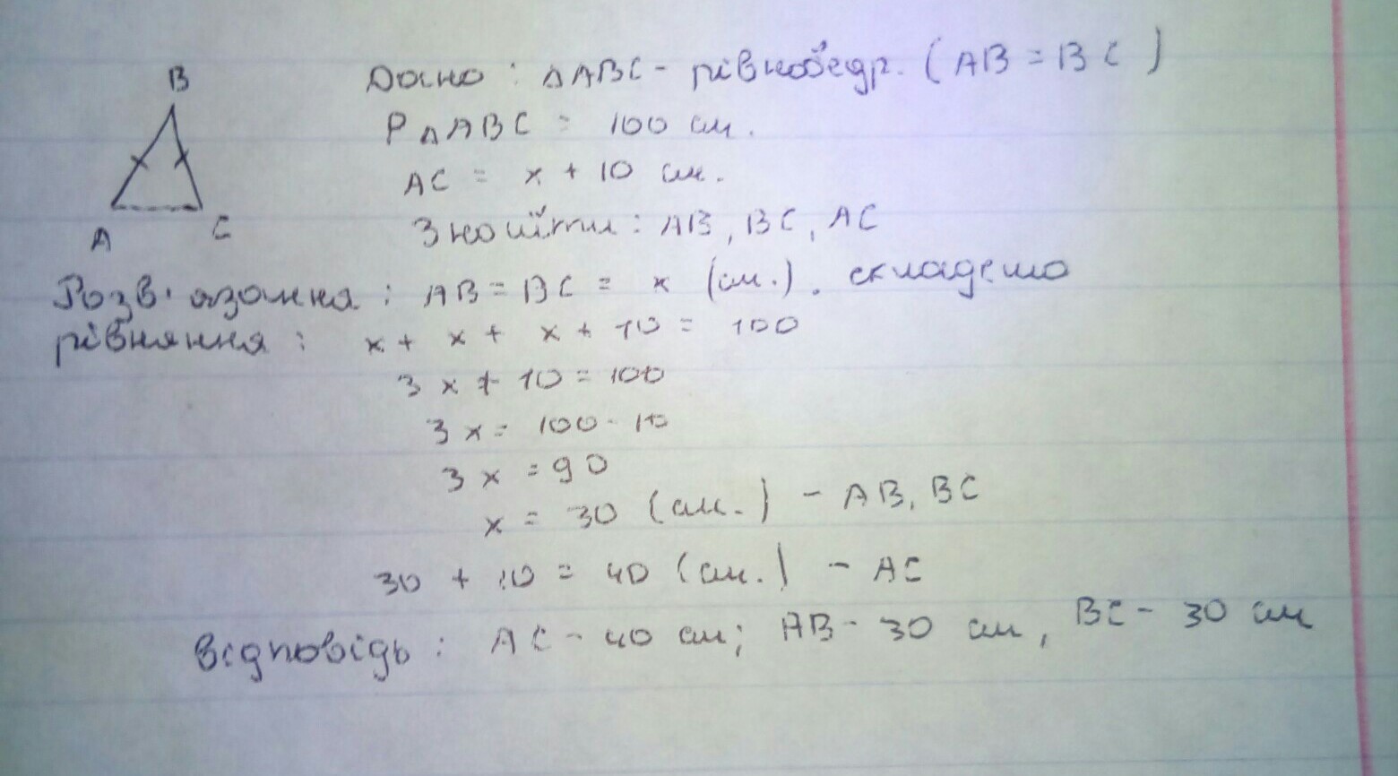 Знайдiть сторони ривнобедренего трикутника якщо його периметр дорiвнюе 100 см, а основа на 10 см бiльше боковойи сторони