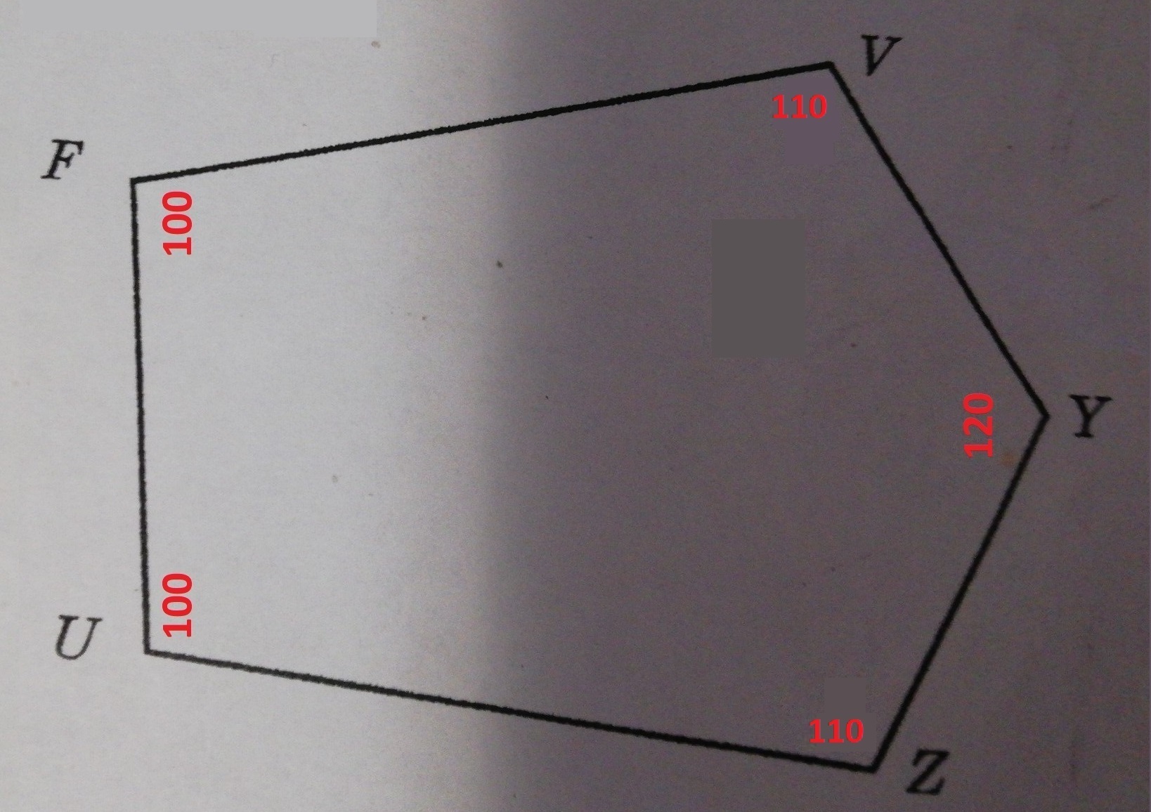 Результаты измерения: два угла по 100°, два по 110° и один в 120°. Сумма углов равна 540°