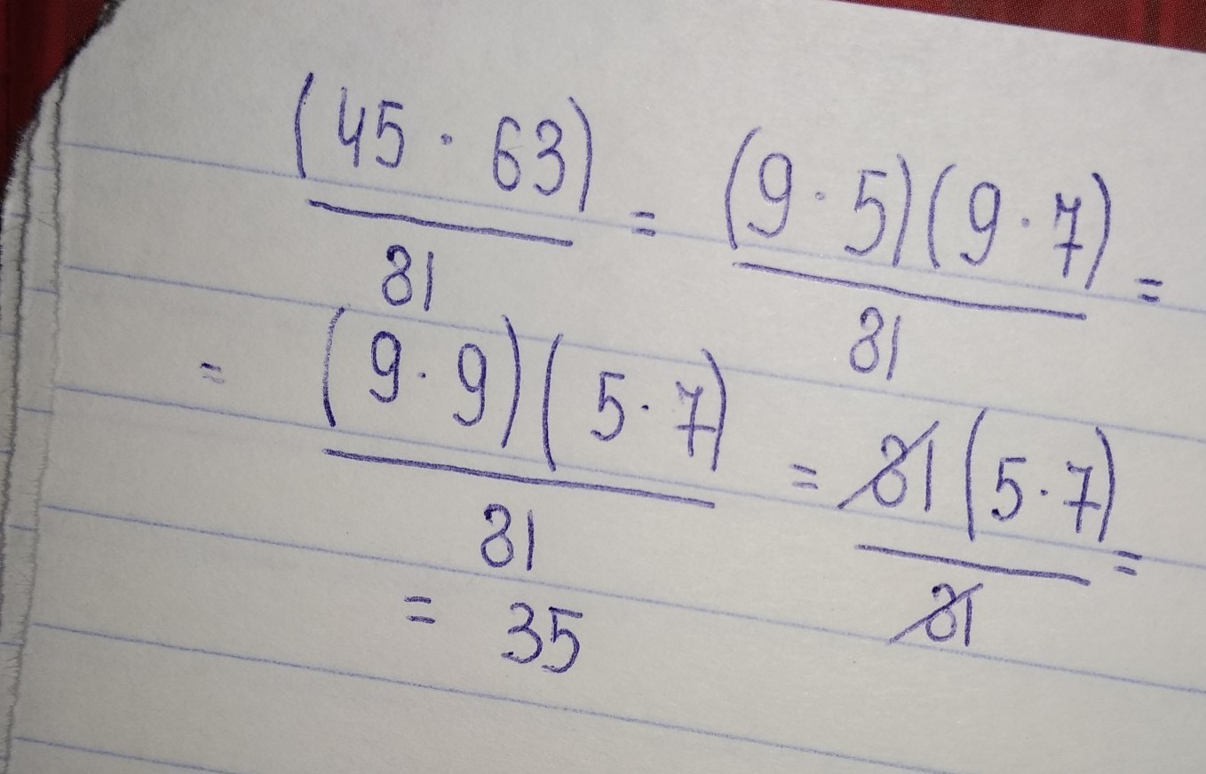 (45x63)/81 = (5*9 * 7*9)/81 = (81 * 5*7)/81 = 5*7 = 35