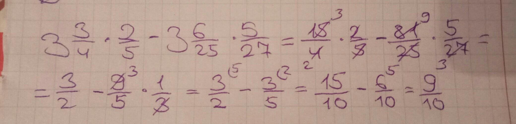 3 3/4×2/5-3 6/25×5/27 = 15/4*2/5 - 81/25*5/27 = 3/2 - 3/5 = 1,5 - 0,6 = 0,9