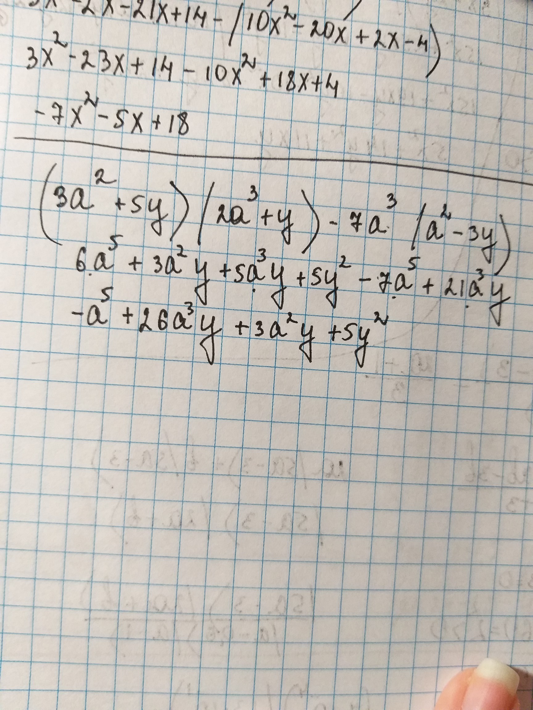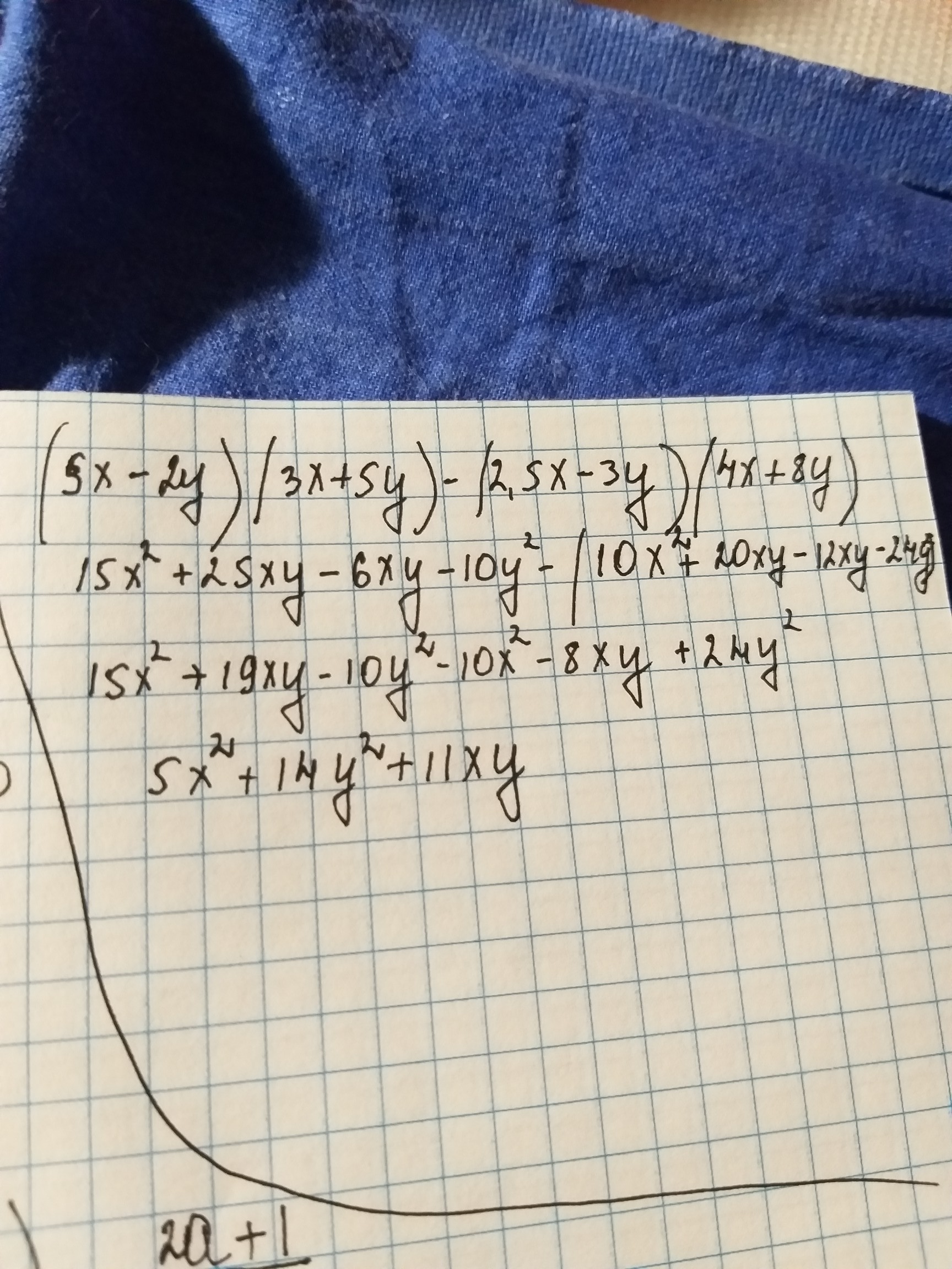 упростите выражения 1) (5X-2Y)(3X+5Y)-(2,5x-3y)(4x+8y) 2) (x-7)(3x-2)-(5x+1)(2x-4) 3)(3a в 2 степени +5y)(2a в 3 степени +y)-7a в 3 степени (a в 2 степени - 3y)